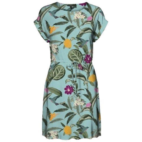 Kjolen er meget pent brukt. Str. 4, som nok tilsvarer liten str. S. Brystmål fra armhule til armhule er 42 cm, midjemål fra side til side er 36 cm og hel lengde fra skulder og ned er 101 cm. 95% polyester og 5% elastan.