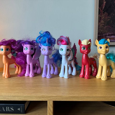 My Little Pony figursett med flere ponnier i plast. Settet består av ulike ponnier/unicorntyper i forskjellige farger, med lange haler og maner som kan børstes og styles. Figurene er laget i hard plast og er egnet som leker for barn som liker My Little Pony-universet, eller som samlefigurer. Den største, med kronen på, kan blinke og løfte vingene.