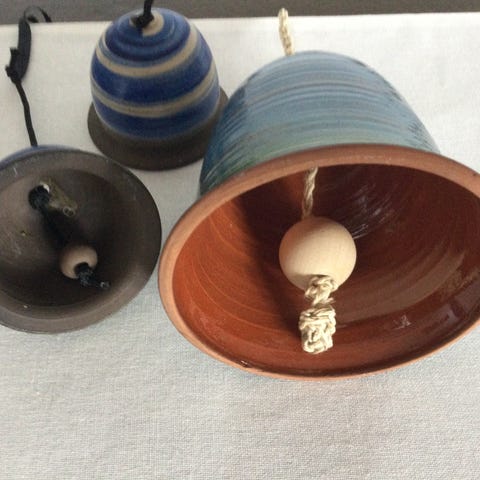 Sett med klokker i ulike størrelser og materialer. En større klokke i glasert keramikk i blå og grønne toner med snor og treperle på toppen. I tillegg flere mindre klokker i metall og keramikk, hovedsakelig i hvitt, messingfarge og blått, noen med røde bånd til oppheng. Klokkene kan brukes som bordpynt, dekor i vindu eller på vegg, eller som jule- og sesongdekorasjon.