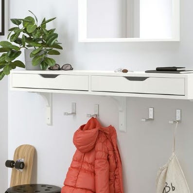 Kommode med 3 skuffer i hvit ramme og mørke tekstilskuffer. Rammen er laget i tre eller trefiber, mens skuffene er i stoff med metallring i front for enkel uttrekking. Møbelet er smalt og høyt, egnet til oppbevaring i for eksempel gang, soverom eller bod. Topplaten kan brukes til å plassere mindre gjenstander eller dekor. Det er noen mindre merker på topplaten, ellers fremstår kommoden som funksjonell.