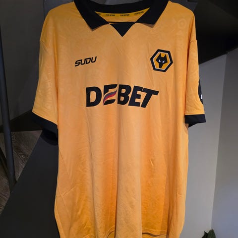 Wolves 2025-26 hjemmedrakt fotballtrøye i gul farge med svarte detaljer. Trøyen er i voksenstørrelse L. Kortermet modell med krage og klubbemblem på brystet. Produsent er SUDU. Designet har mønster i stoffet på baksiden og sponsorlogoer på front og ermer. Egnet som supportereffekter eller til bruk ved trening og fritid.
