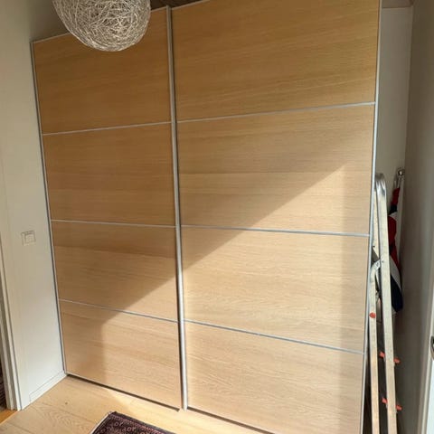 2 sett skyvedører til garderobe i god stand som er enkle å håndtere. De er montert i åpning på 250 cm og 252 cm. Høyden kan altså være litt fleksibel.