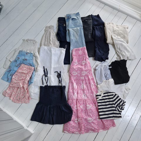 Klespakke størrelse 152. Anmerkninger samlet på siste bilde, kan forekommer mer som jeg ikke har sett, flekker går potensielt bort med gallesåpe. Inneholder: