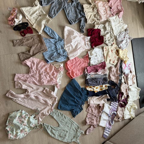 Selger unna litt av barnehageklærna til mini. Varierende slitasje og bruk, men alt er helt. Noe løse tråder osv på strikket heldrakt.