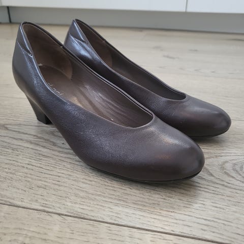 Gabor pumps i størrelse 35. Skoene er laget i blank lakkfinish i en mørk brunfarge. Noen små merker i lakken, men ikke veldig synlige. Fortsatt i veldig god stand.
