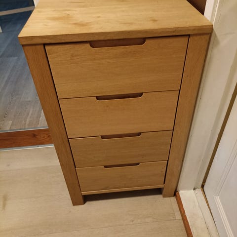 Kommoden ble satt sammen for et år siden, og er ikke synlig brukt. Praktisk for oppbevaring, med smart åpneløsning hvor man trykker inn på midten av skuffen.