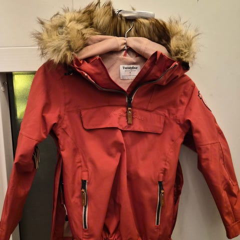Størrelse 140-146. Den er brukt 1,5 vintersesong. Noe synlig at den er brukt, men hel og i god stand. Mye vinterbukse igjen.