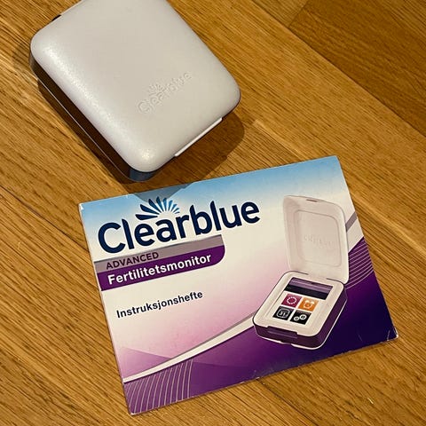 Clearblue fertilitetsmonitor i etui i hvit og lilla farge. Enheten brukes sammen med tilhørende teststaver (ikke synlig på bildene) for å overvåke og registrere fertilitetssignaler over tid. Skjermen viser kalender og resultatert. Egnet for hjemmebruk for personer som ønsker å følge egen syklus og fertilitet. Har et par tester som kan følges med.