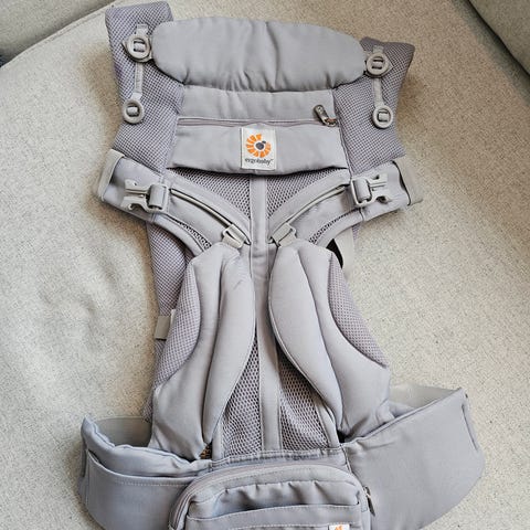 Selger en Ergobaby bæresele av typen Omni 360 cool air. Brukt av ett barn. Bæreselen er hel og fin. Det følger med en liten veske man kan feste på bæreselen. Det følger også med et regntrekk med fleecefor som man kan feste over bæreselen slik at baby holder seg tørr og varm.