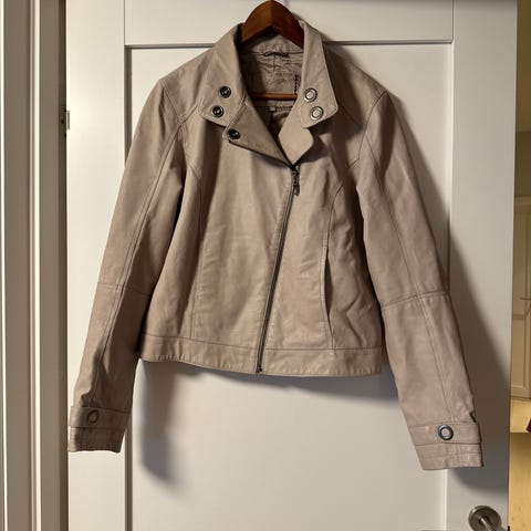Kul cream farget skinn jakke/blazer svært lite brukt. Str 38 Nypris 3000kr selges billig.