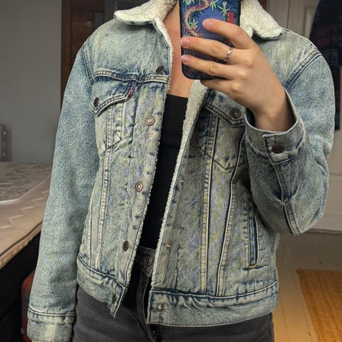 Holzweiler jakke i denim for dame i størrelse S. Jakken er flerfarget med kombinasjon av denim og kontrastpaneler i teddy-/fuskepelsmateriale foran og bak. Klassisk krage og knappelukking i front. Passer som en ytterjakke i overgangssesonger eller på kjølige dager. Materiale hovedsakelig denim med myke paneler som gir ekstra komfort og struktur i designet.