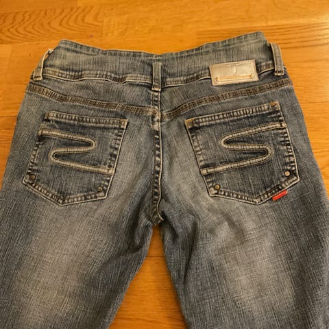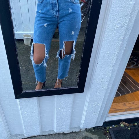 Bik Bok jeans i grå denim for dame. Buksen er i størrelse S med livvidde W25, men er oversized så er ikke veldig smal.
