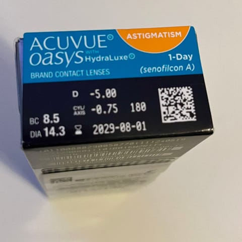 Acuvue Oasys HydraLuxe kontaktlinser 1-day for astigmatisme. Endags myke kontaktlinser for korrigering av astigmatisme. Esken på bildet viser styrke -5.25, sylinder -0.75, akse 180, basekurve 8.5 og diameter 14.3. Linsene har UV-blokkering ifølge pakningen og er beregnet på engangsbruk per dag. Passer for unisex brukere som trenger toriske endagslinser med tilsvarende styrke og parametere. Kontrollér alltid egne styrker og spesifikasjoner før bruk.