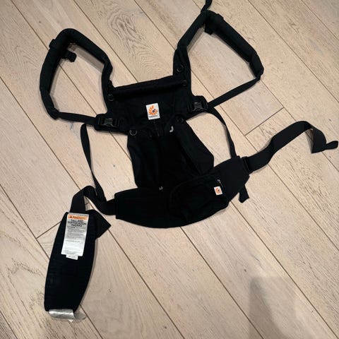 Ergobaby bæreselle i svart og beige. Bæresellen har polstrede skulderstropper og midjebelte for jevn vektfordeling. Den er egnet for bæring av baby og småbarn, og gir støtte til både barnets rygg og hofter. Stoffet er mykt mot barnets hud, og selen har justerbare stropper for tilpasning til ulike brukere. På bildet følger det også med en løs del/innlegg i grått som kan brukes sammen med bæresellen etter behov.