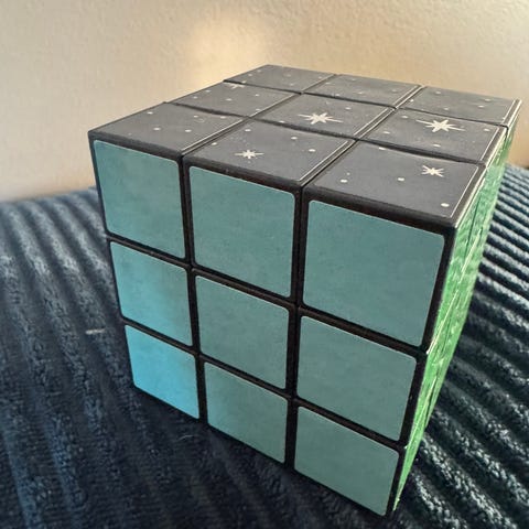 Selger tre roterende puslespill-kuber (Rubiks-type). To er klassiske fargekuber, og én har Harry Potter-motiv på rutene.
