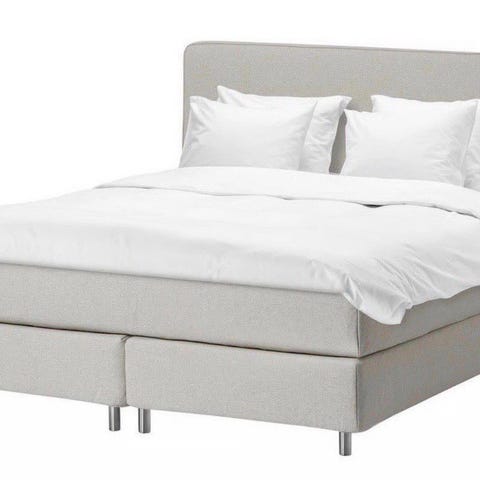 IKEA seng. Rektangulær seng med polstret ramme og nøytral lys trekkfarge. Egnet som enkeltseng i soverom eller gjesterom. Passer for én person, og kan brukes med standard madrass i tilsvarende størrelse som rammen.