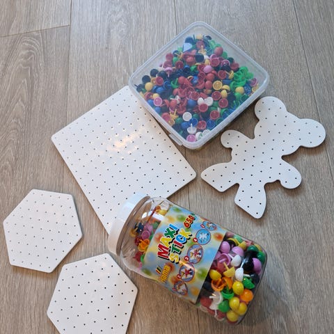 Sett med Hama maxi stick perler og perleplate formet som en bamse.
