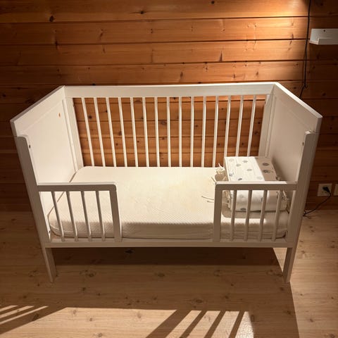 IKEA sprinkelseng i hvit farge. Klassisk barneseng Egnet for små barn/baby. Sengen har madrass og sengetøy som følger med. Passer til bruk på barnerom eller soverom som trygg soveplass for barn.