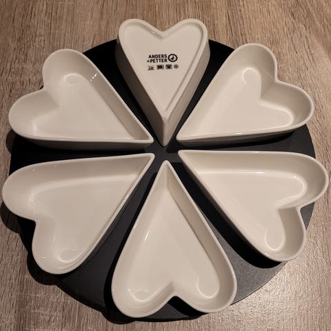 Serveringssett med hjerteformede skåler på en roterende brett, som er det perfekte tilbehøret til din borddekking. Skålene passer bra for både varme og kalde retter, og den roterende bretten gjør det enkelt å nå alle skålene, noe som gjør dette settet både praktisk og stilig for servering av snacks, frukt eller småplukk ved fester og middager.