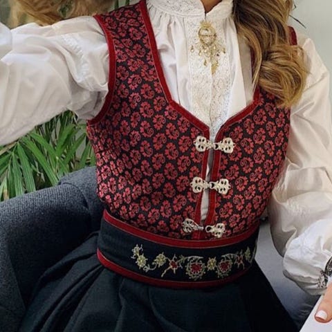 Selger min fine festdrakt. Modellen er Berit fra Sparkjøp i størrelse 38/40. Hvit skjorte følger med, den er også i størrelse 38/40. Selger den grunnet størrelsen er blitt for stor. Jeg kjøpte den som et alternativ til bunaden når jeg var gravid. Hektene kan lett flyttes og justeres etter ønske, slik jeg har gjort (vist på siste bilde).