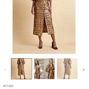 Love Lolina festkjole i gullfarget polyester i one size til dame. Kjolen har høy hals med liten volangkant, lange ermer med strikk og rysjer ved mansjettene samt markert midje. Skjørtet er lett utsvingt med legg som gir bevegelse i stoffet. Materialet har en skinnende, strukturert overflate som gir et metallisk preg. Passer som penkjole til ulike anledninger der en festkjole ønskes.