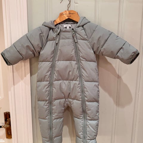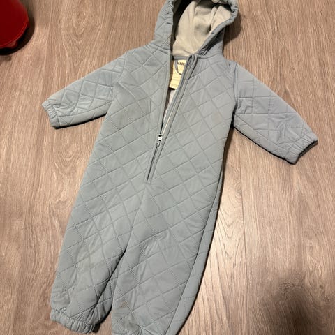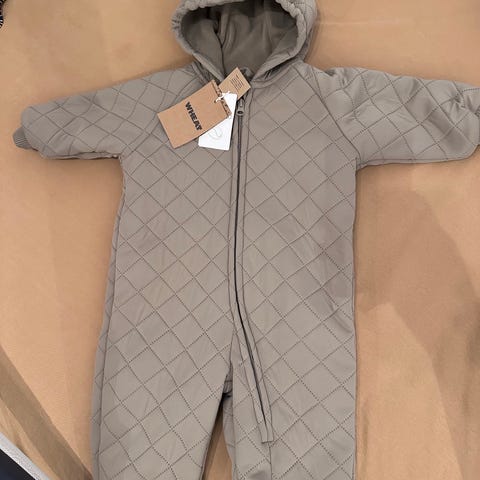 Polarn O. Pyret vindtett vattert heldress for barn i størrelse 68. Modellen har hette, gjennomgående glidelås foran og vattert, quiltet mønster. Erm- og benavslutninger har brettbare kanter som kan brukes til å dekke hender og føtter.