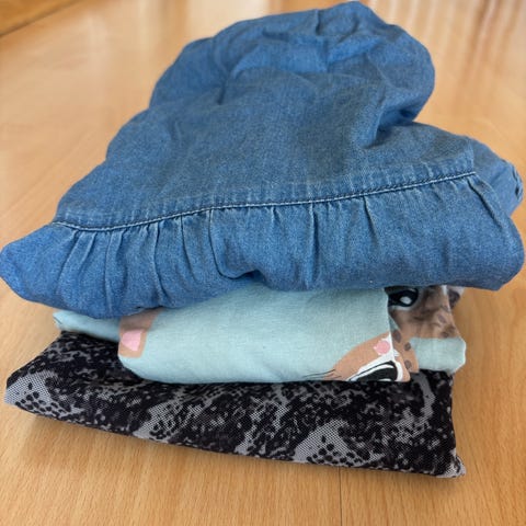 En tykk og en tynn tights i str 122. Oppdaget at den tykke har noen små hull øverst ved lommene bak, dette burde være enkelt og raskt og fikse for noen andre enn meg.
