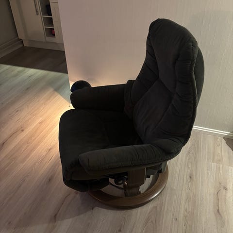 Som nye, med fotskammel. Beige, skinn. Regulerbar nakkestøtte. Har 2 stk like. Kr 8000 pr stk med fotskammel.