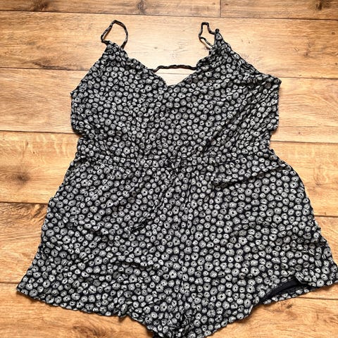 H&M jumpsuit for dame i størrelse XL. Plagget er grønt og laget i viskose. Jumpsuiten har korte ermer, V-utringning og lang benlengde. Den har innsving i midjen og lommer i sidene. Passer til hverdagsbruk eller enkle anledninger.