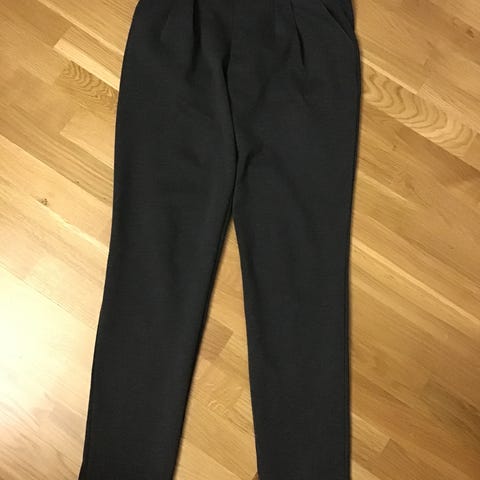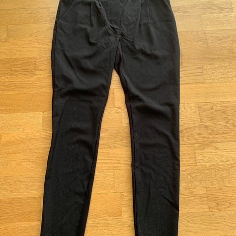 Bukse for dame i størrelse S. Buksen er svart og har smal passform med lange ben. Egner seg til hverdagsbruk eller enkel pen bekledning, avhengig av hva den kombineres med.