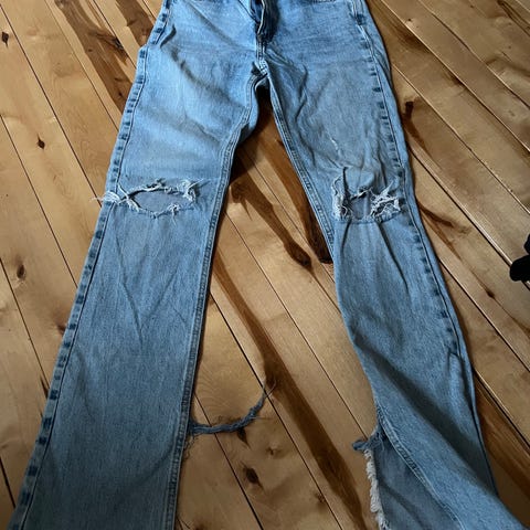 Pent brukt Zara jeans med tøffe hull på kneet. 98% bomull, og 2% elastan. Pen topp av 70% viscose og 30% elastan. Veldig fin skjæring i halsen.