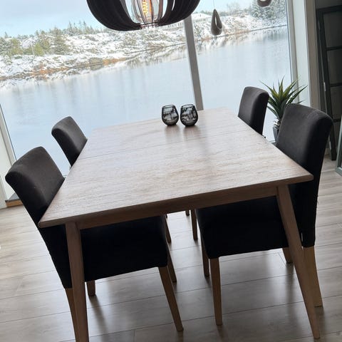 Spisegruppe selges. Connect spisebord fra skeidar + 6 sortr velour stoler. Kvittering for kjøp kan fremvises. Bordplaten er av lakkert eikefiner. Bordplaten har jevnlig blitt behandlet med bivoks for å opprettholde den fin. Bivoks kan følge med kjøp.