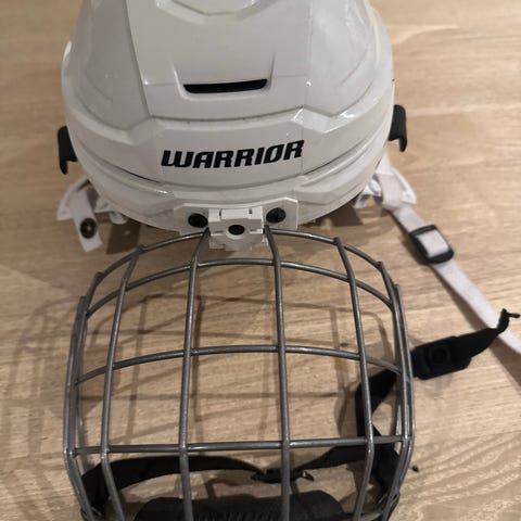 Warrior Alpha One ishockeyhjelm med gitter i hvit farge. Hjelmen har justeringshjul bak for tilpasning av passform og polstret innside for komfort og støtdemping. Kun brukt et fåtalls ganger da denne ble litt liten i størrelsen. Oppgitt størrelse fra 47cm-55cm men ble litt trang for et hode på på 53,5cm.. ny pris 1200,-