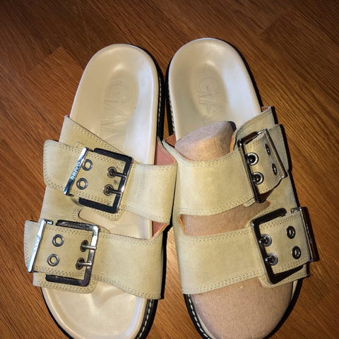 Scholl Sandaler i størrelse 40. Modellen har tre justerbare remmer med spenner over foten. Fargeopplevelsen er svart med metallfargede spenner. Sålen er formet for foten og har åpen tå og hæl. Egnet som hverdagssandaler eller innesko.