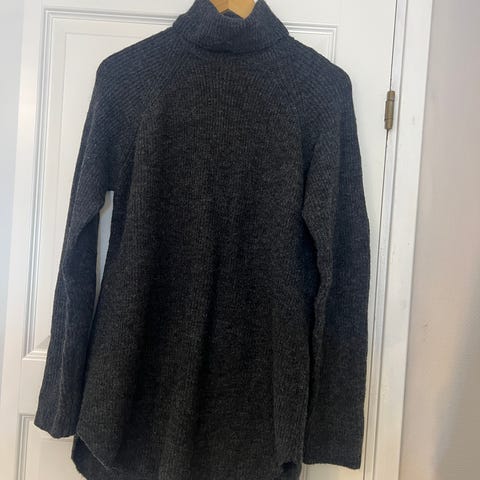 Kaffe Kagabby genser for dame i størrelse M. Genseren er grønn (fargenavn Green Spruce) og laget av ull. Modellen har høy hals og lange ermer. Plagget er laget av fine og sensitive fibre, noe som kan gi noe nupper ved bruk. Egnet som en varm og myk ullgenser til hverdagsbruk. Romslig i str. passer også en L muligens XL.