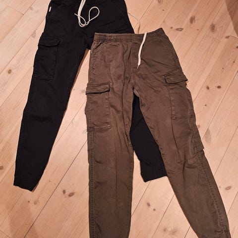 Vailent bukser for herre i størrelse L. Buksen er beige / lys grønn/ kamuflasje grønn-svart og laget i bomull. Modellen har strikk og snøring i livet, sidelommer og cargolommer på lårene. Passer som hverdagsbukse eller fritidsbukse.