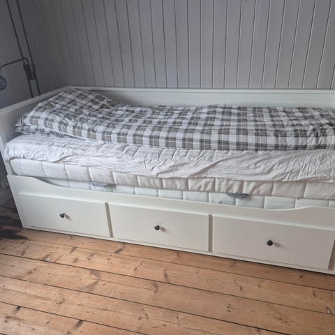IKEA seng med integrerte oppbevaringsskuffer under liggeflaten. Sengen er i hvit utførelse og har rette sidepaneler og hode-/endegavl. Skuffene gir ekstra lagringsplass for for eksempel sengetøy eller klær. Egnet som enkeltseng på soverom, barnerom eller gjesterom. Bildene viser at det er synlig slitasje og avskalling på enkelte kanter av rammen.