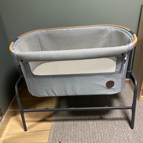 Selger en pent brukt Maxi-Cosi Iora Bedside Crib i grått. Praktisk og trygg babyseng som kan brukes både frittstående og som bedside crib ved siden av sengen. Enkel å justere i høyden, med god oppbevaringsplass under. Madrass og laken kan følge med.