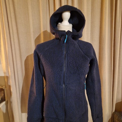 Den har hette, hel glidelås i front og to sidelommer med glidelås. Ermene er lange, og fasongen er tilpasset dame.