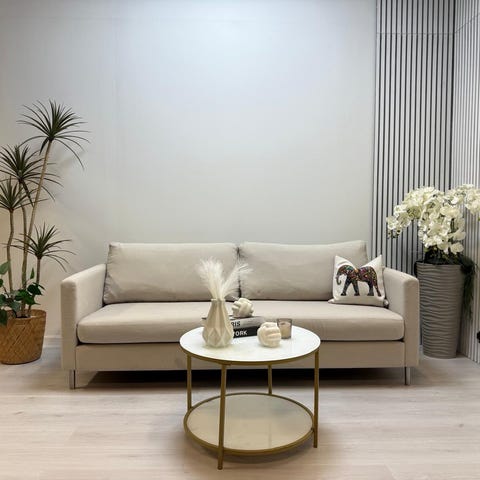 Den er trukket i et mykt babyvelour tekstil i dus rosatoner, og har en komfortabel sitteflate med god ryggstøtte. Sofaen har kun stått til utstilling og er lite brukt, uten kjente skader eller slitasje.