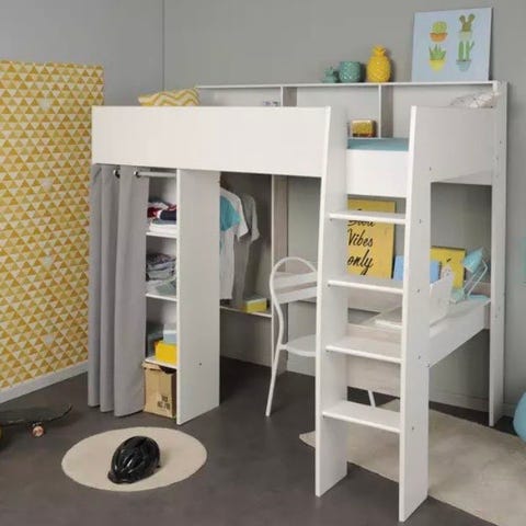Hoppekids køyeseng for barn i hvit utførelse. Sengen har øvre liggeplass med stige i midten og underdel som kan brukes som sitteplass med bordløsning, eller som seng med de medfølgende sitteputene.