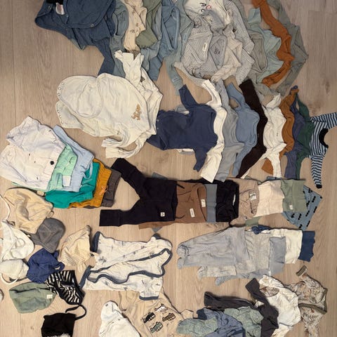 Selger en stor klespakke som inneholder gode klær i ull og bomull i str 50/56. Klærne er i nøytrale farger - brukt både til jente og gutt. Pakken inneholder klær fra Voksi, Newbie, Hust&Clear, Polarn O.Pyret, Name It, Kuling, Helledussen. Også noe fra H&M og Cubus, men kun ull/bomull, samt hjemmestrikk.