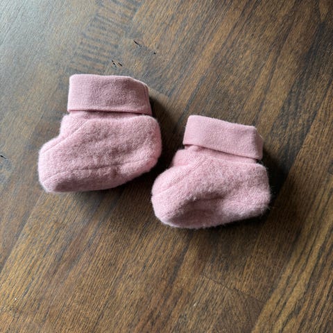 Reflex Tovdal babyvotter og tøfler i str 0–1 år i fargen gammelrosa. Litt små i str og ble derfor ikke brukt. Elastisk ribb holder både vottene og tøflene på pass. Snor på vottene.