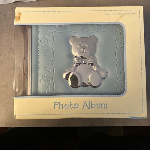 Minnebok fra Eik i lys blå velour med tinndekor som kan graveres. Fortrykte ark som følger barnet fra nyfødt til ca. 3 år. God plass til notater og bilder.