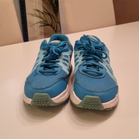 Hoka løpesko i størrelse 40. Skoene er blå med hvite og gule detaljer. Overdel i pustende mesh-materiale og yttersåle med mønster som gir godt grep til løping. Egnet til løping og annen trening utendørs eller innendørs.