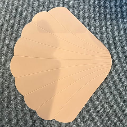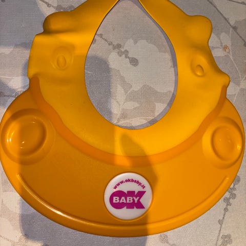 Rosa dusjhette for barn i plast. Utformet for å skjerme ansikt og øyne mot vann, for eksempel ved hårvask i dusj eller badekar.