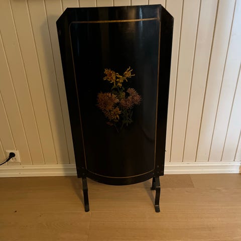 Frittstående peisskjerm / ovnsskjold i svart metall. Skjermen har buet front og står på to dekorative metallben. Fronten er dekorert med et ovalt felt med blomstermotiv og omramming. Egnet som beskyttelse foran peis eller ovn, og som dekorativt innslag i stuen. Skjermen er laget i metall og er beregnet for innendørs bruk.