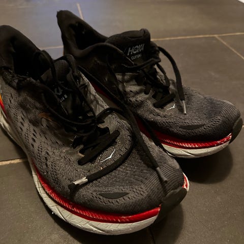 Hoka One One Clifton løpesko i størrelse 42. Skoene er laget for løping og har overdel i pustende meshmateriale. Fargen er hovedsakelig blå med grønne og gule detaljer. Yttersålen har gummipartier for grep, og mellomsålen er tykk for demping under løping på asfalt eller hardt underlag. Passer til løping og annen trening der det er behov for lette og dempede sko.