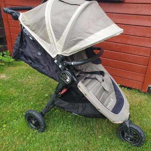 Baby Jogger City Mini sportsvogn i svart. Vognen har tre hjul med svingbart forhjul, egnet for bykjøring og turer på jevnt underlag. Setet har polstret sitteflate, justerbar rygg og fempunktssele. Stor kalesje gir god skjerming mot sol og lett vær. Vognen kan legges sammen kompakt ved hjelp av håndtak i setet, noe som gjør den enkel å oppbevare og transportere. Under setet er det oppbevaringskurv til bagasje.