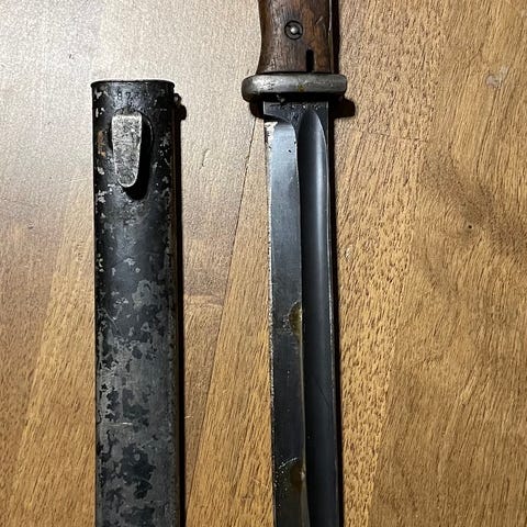 En tysk S84/98 III K98 bajonett med slire fra andre verdenskrig. Bajonetten er produsentmerket og datert "41 crs" = 1941 Paul Weyersberg fra Solingen med korrekt nazistisk Waffen-godkjenning WaA883. Bladet har flere intakte merker fra brukstid